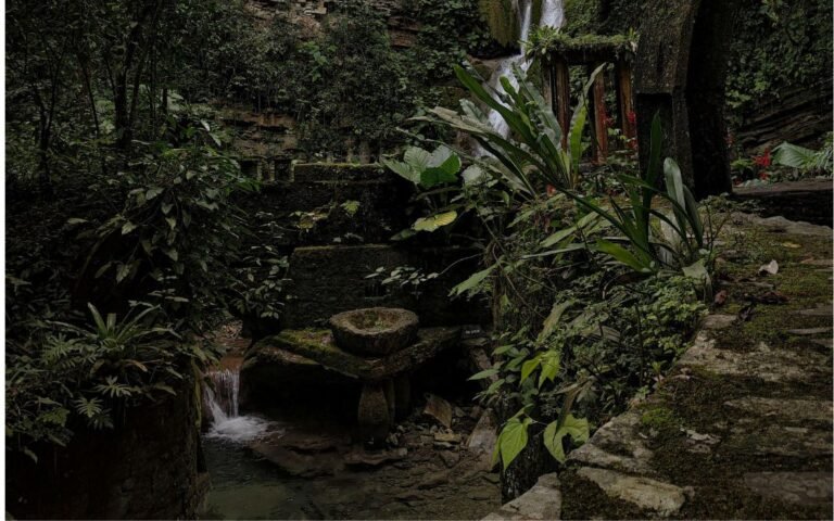Caminarás entre columnas que sostienen el cielo, escaleras que no llevan a ningún lado, puentes sobre piscinas naturales y estructuras imposibles rodeadas de vegetación exuberante. Este lugar desafía la lógica: arte, naturaleza y obsesión entrelazados.
